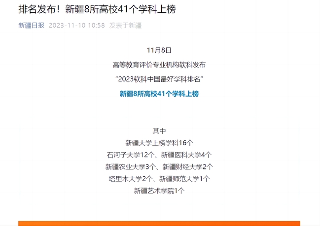 11月8日,高等教育评价专业机构软科发布“2023软科中国最好学科排名”,新疆8所高校41个学科上榜。