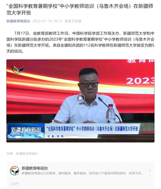 7月17日,由教育部教师工作司,中国科学院学部工作局主办,新疆师范大学和中国科学院新疆分院承办的2023年“全国科学教育暑期学校”中小学教师培训(乌鲁木齐会场)在新疆师范大学开班。来自全疆和兵团的112名科学教师在新疆师范大学接受为期5天的培训。