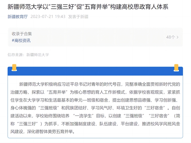 新疆师范大学积极响应习近平总书记对青年的时代号召,完整准确全面贯彻新时代党的治疆方略,探索以“五育并举”为核心思想的育人工作新模式,依据学校客观现实,紧紧抓住学生在大学学习和生活最基本的单元—班级和宿舍,提出创建思想品德强、学习创新强、身心体魄强的“三强班级”和民族团结好、学习风气好、环境卫生好的“三好宿舍”。自创建活动以来,学校始终围绕培养 “一流学生”目标,以创建“三强班级”“三好宿舍”(简称“三强三好”)为抓手,不断加强制度建设、队伍建设、平台建设,推进校风学风班风舍风建设,深化德智体美劳五育并举。