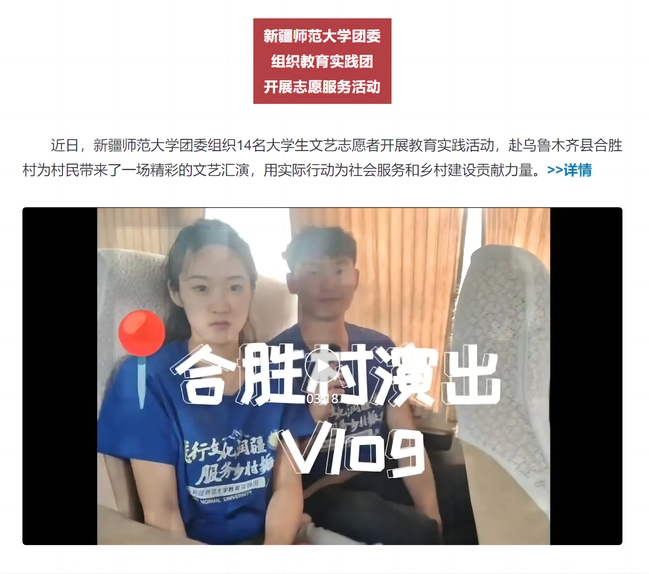 近日,新疆师范大学团委组织14名大学生文艺志愿者开展教育实践活动,赴乌鲁木齐县合胜村为村民带来了一场精彩的文艺汇演,用实际行动为社会服务和乡村建设贡献力量。