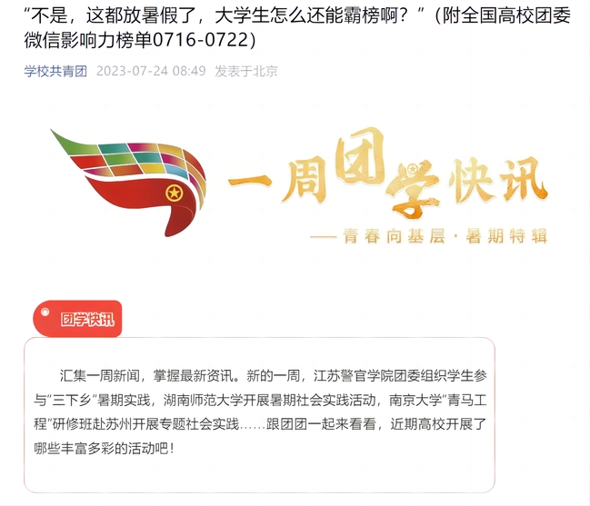 汇集一周新闻,掌握最新资讯。新的一周,江苏警官学院团委组织学生参与“三下乡”暑期实践,湖南师范大学开展暑期社会实践活动,南京大学“青马工程”研修班赴苏州开展专题社会实践……跟团团一起来看看,近期高校开展了哪些丰富多彩的活动吧!