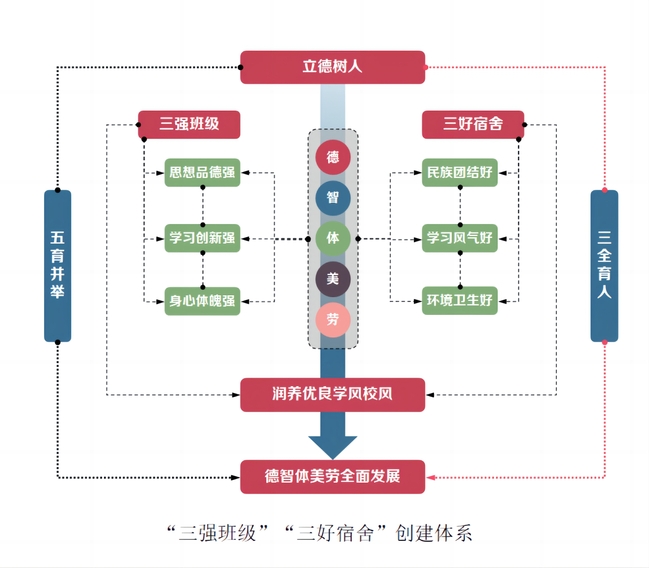 新疆师范大学坚持以党建为引领,以“立德树人”为根本任务,以“三全育人”为实施路径,聚焦“五育并举”的核心思想,以2020年5月校党委提出的“三强班级”“三好宿舍”创建为载体,秉持“思政育人、文化润人、品行立人”的育人内涵,探索“一站式”学生社区综合管理模式建设,打造“五育并举”的“一站式”浸润式育人环境,构建社区化全方位思政育人体系。