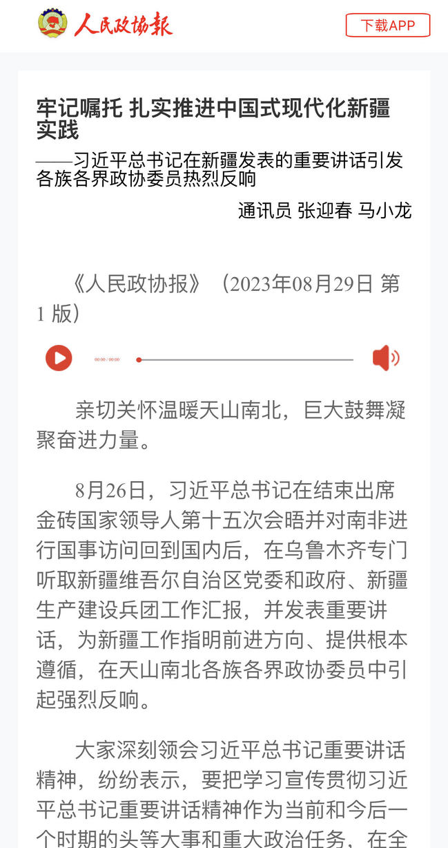 8月26日,习近平总书记在结束出席金砖国家领导人第十五次会晤并对南非进行国事访问回到国内后,在乌鲁木齐专门听取新疆维吾尔自治区党委和政府、新疆生产建设兵团工作汇报,并发表重要讲话,为新疆工作指明前进方向、提供根本遵循,在天山南北各族各界政协委员中引起强烈反响。