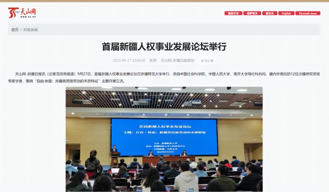 “通过辛勤劳动,新疆各族群众能够掌握新技能,从吃饱到吃好,从穿暖到穿美,从毛驴车代步到现代交通工具出行,生活条件不断改善。”中国社会科学院中国边疆研究所研究员许建英以《自主劳动是新疆各族人民幸福生活的保障》为主题作发言;中国人民大学法学院教授朱力宇阐述了中国在联合国人权理事会关于涉疆问题的立场和理论依据;南开大学人权研究中心主任、教授常健发言时表示,在中国式现代化进程中,新疆政府在保障体面工作权方面采取积极和富有成效的举措,使得这一重要的基本人权得到更加切实的保障。