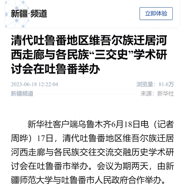 新华社客户端乌鲁木齐6月18日电(记者周晔)17日,清代吐鲁番地区维吾尔族迁居河西走廊与各民族交往交流交融历史学术研讨会在吐鲁番市举办。会议为期两天,由新疆师范大学与吐鲁番市人民政府合作举办。