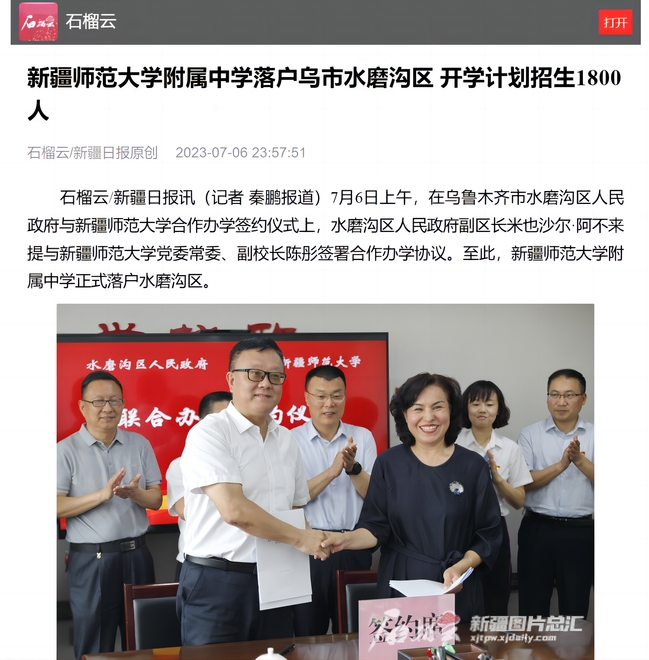 石榴云/新疆日报讯(记者 秦鹏报道)7月6日上午,在乌鲁木齐市水磨沟区人民政府与新疆师范大学合作办学签约仪式上,水磨沟区人民政府副区长米也沙尔·阿不来提与新疆师范大学党委常委、副校长陈彤签署合作办学协议。至此,新疆师范大学附属中学正式落户水磨沟区。