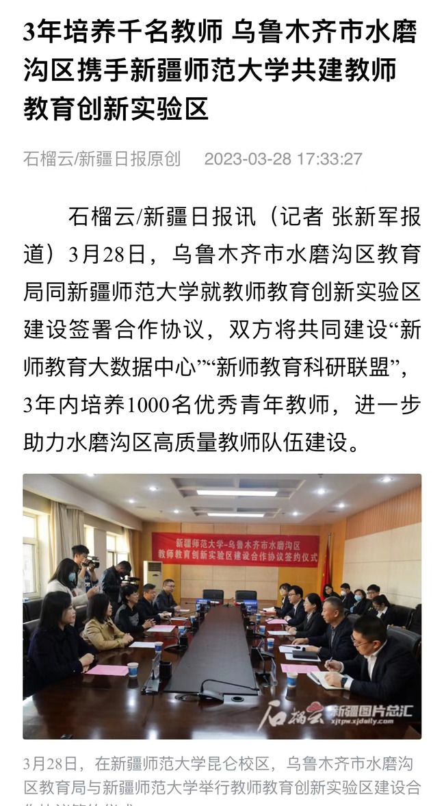 石榴云/新疆日报讯(记者 张新军报道)3月28日,乌鲁木齐市水磨沟区教育局同新疆师范大学就教师教育创新实验区建设签署合作协议,双方将共同建设“新师教育大数据中心”“新师教育科研联盟”,3年内培养1000名优秀青年教师,进一步助力水磨沟区高质量教师队伍建设。