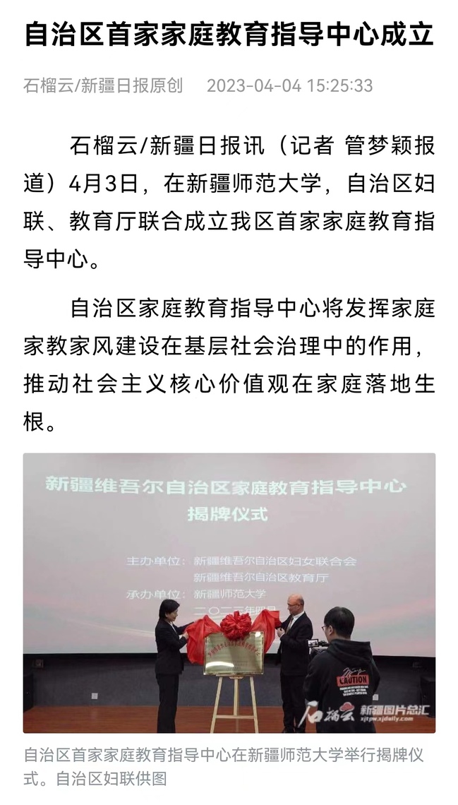 石榴云/新疆日报讯(记者 管梦颖报道)4月3日,在新疆师范大学,自治区妇联、教育厅联合成立我区首家家庭教育指导中心。