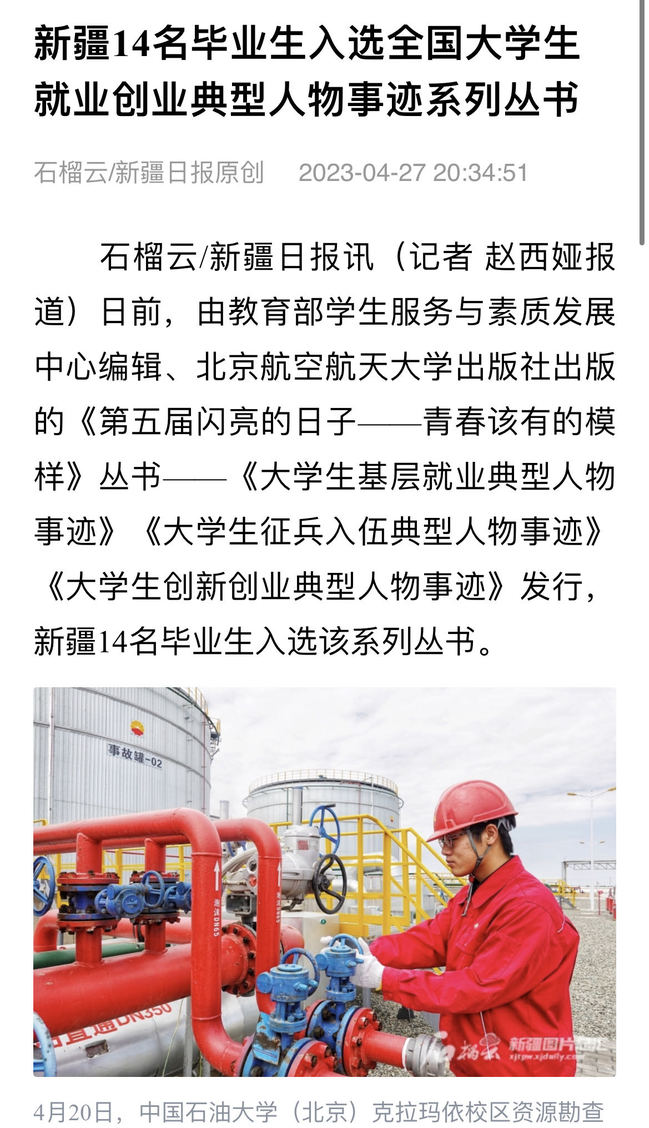 1.入选《大学生基层就业典型人物事迹》的有:中国石油大学(北京)克拉玛依校区的王良哲、新疆师范大学的刘梦凯、新疆大学的王青青、新疆医科大学的蒋博峰、昌吉学院的阿依米日·奥布力喀斯木。他们扎根基层,用脚步丈量祖国大地,用耳朵倾听人民呼声,将“小我”融入“大我”,在服务祖国、服务边疆的生动实践中谱写着人生故事,成就青春梦想。