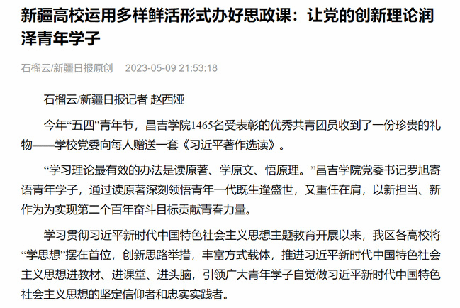石榴云/新疆日报记者 赵西娅 今年“五四”青年节,昌吉学院1465名受表彰的优秀共青团员收到了一份珍贵的礼物——学校党委向每人赠送一套《习近平著作选读》。