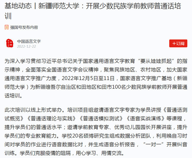 为深入学习贯彻习近平总书记关于国家通用语言文字教育“要从娃娃抓起”的指示精神,全面落实全国语言文字会议精神,聚焦民族地区、农村地区,加大国家通用语言文字推广力度,2022年12月5日至11日,国家语言文字推广基地(新疆师范大学)为新疆维吾尔自治区和田地区和田市100名少数民族学前教师开展普通话培训。