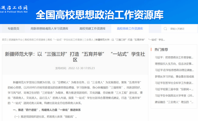 新疆师范大学坚持以党建为引领,以“立德树人”为根本任务,以“三全育人”为实施路径,聚焦“五育并举”的核心思想,以2020年5月校党委提出的创建思想品德强、学习创新强、身心体魄强的“三强班级”、民族团结好、学习风气好、环境卫生好的“三好宿舍”为载体,着力推进党团组织、文化润疆、劳动教育“三大工程”进社区,秉持“思政育人、文化润人、品行立人”的育人内涵,探索“一站式”学生社区综合管理模式建设,打造“五育并举”的“一站式”浸润式育人环境,构建社区化全方位思政育人体系。