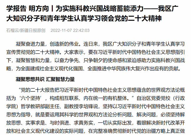 凝聚奋进力量,创造新的伟业。连日来,我区广大知识分子和青年学生认真学习宣传贯彻党的二十大精神。大家表示,要在习近平新时代中国特色社会主义思想指引下,凝聚智慧和力量,以奋力争先、只争朝夕的使命感和紧迫感助力实施科教兴国战略,为全面建成社会主义现代化强国、全面推进中华民族伟大复兴作出应有的贡献。