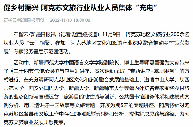 石榴云/新疆日报讯(记者 赵西娅报道)11月9日,阿克苏地区文旅行业200余名从业人员“云”相聚,参加“阿克苏地区文化和旅游产业深度融合推动乡村振兴发展”专家服务基层示范团活动。