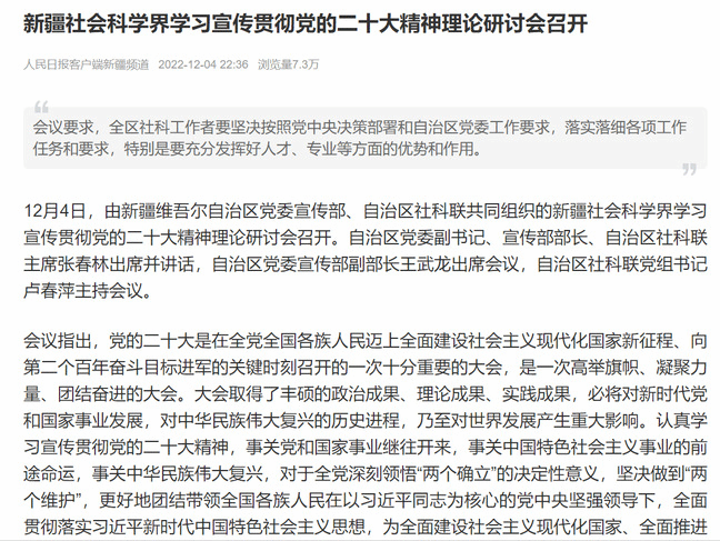 12月4日,由新疆维吾尔自治区党委宣传部、自治区社科联共同组织的新疆社会科学界学习宣传贯彻党的二十大精神理论研讨会召开。自治区党委副书记、宣传部部长、自治区社科联主席张春林出席并讲话,自治区党委宣传部副部长王武龙出席会议,自治区社科联党组书记卢春萍主持会议。