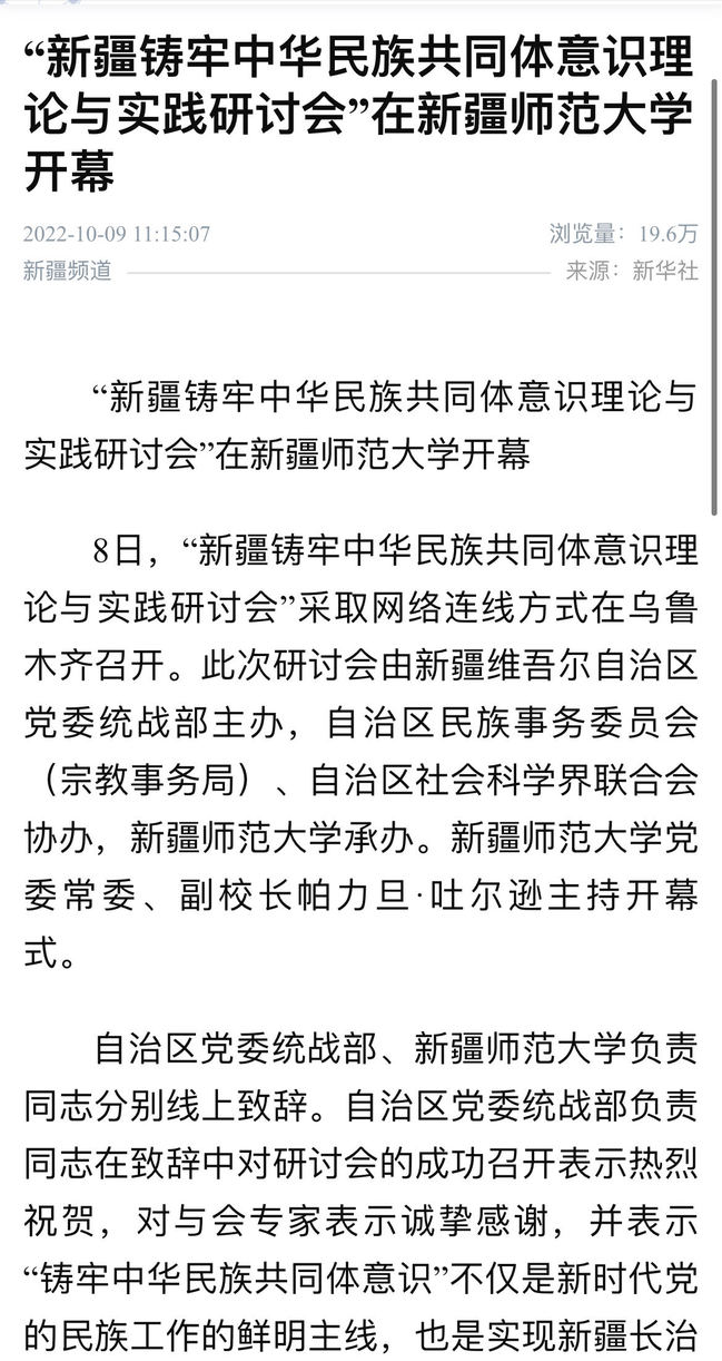 8日,“新疆铸牢中华民族共同体意识理论与实践研讨会”采取网络连线方式在乌鲁木齐召开。此次研讨会由新疆维吾尔自治区党委统战部主办,自治区民族事务委员会(宗教事务局)、自治区社会科学界联合会协办,新疆师范大学承办。新疆师范大学党委常委、副校长帕力旦·吐尔逊主持开幕式。