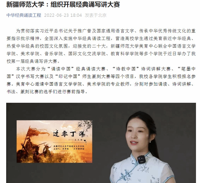 为贯彻落实习近平总书记关于推广普及国家通用语言文字、传承中华优秀传统文化的重要指示批示精神,全面深入实施中华经典诵读工程,营造高校学生通过美育亲近中华经典、热爱中华经典的校园文化氛围,迎接党的二十大,新疆师范大学美育中心联合中国语言文学学院、美术学院、音乐学院、国际文化交流学院、教育科学学院等多个学院于近日举办了我校第一届经典诵写讲大赛。本次大赛分为“诵读中国”经典诵读大赛、“诗教中国”诗词讲解大赛、“笔墨中国”汉字书写大赛以及“印记中国”师生篆刻大赛等四个项目,我校各学院学生积极报名参赛。美育中心邀请中国语言文学学院、美术学院的专业教师,分别对参加诵读、诗词讲解、书法、篆刻比赛的选手们进行赛前指导。