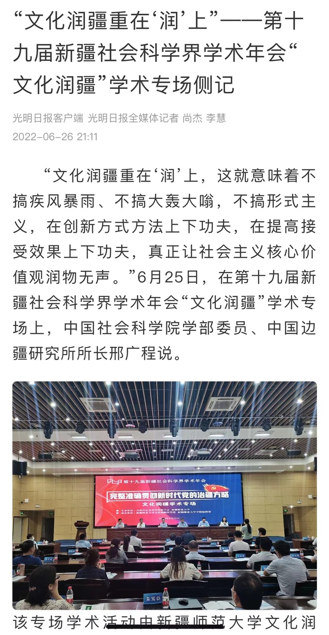 该专场学术活动由新疆师范大学文化润疆研究院、新疆师范大学学报编辑部承办,也是新疆师范大学举行的首届“文化润疆”高端论坛。活动面向自治区哲学社会科学工作者公开征稿,共征集到来自43家单位推荐的170篇论文,凸显了“文化润疆”成为近年社科界研究热点。