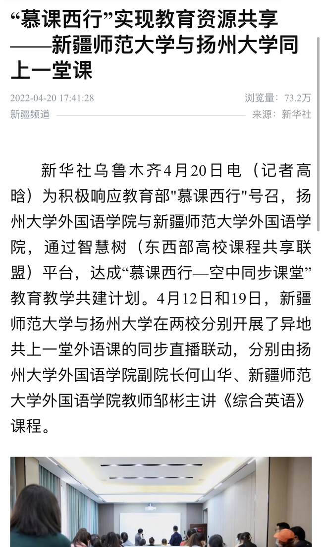 新华社乌鲁木齐4月20日电(记者高晗) 为积极响应教育部慕课西行号召,扬州大学外国语学院与新疆师范大学外国语学院,通过智慧树(东西部高校课程共享联盟)平台,达成“慕课西行—空中同步课堂”教育教学共建计划。4月12日和19日,新疆师范大学与扬州大学在两校分别开展了异地共上一堂外语课的同步直播联动,分别由扬州大学外国语学院副院长何山华、新疆师范大学外国语学院教师邹彬主讲《综合英语》课程。