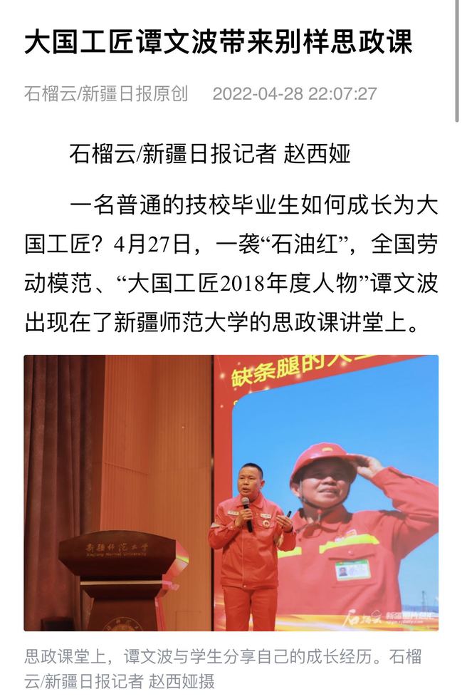 一名普通的技校毕业生如何成长为大国工匠?4月27日,一袭“石油红”,全国劳动模范、“大国工匠2018年度人物”谭文波出现在了新疆师范大学的思政课讲堂上。