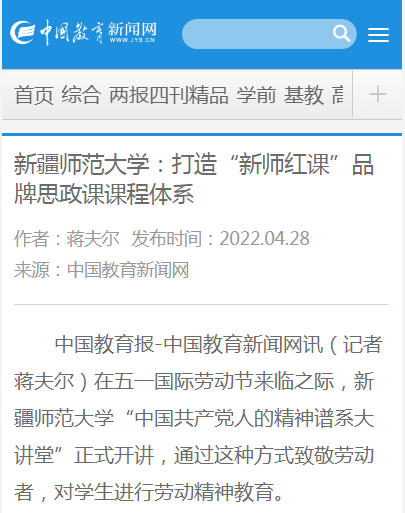 中国教育报-中国教育新闻网讯(记者 蒋夫尔)在五一国际劳动节来临之际,新疆师范大学“中国共产党人的精神谱系大讲堂”正式开讲,通过这种方式致敬劳动者,对学生进行劳动精神教育。