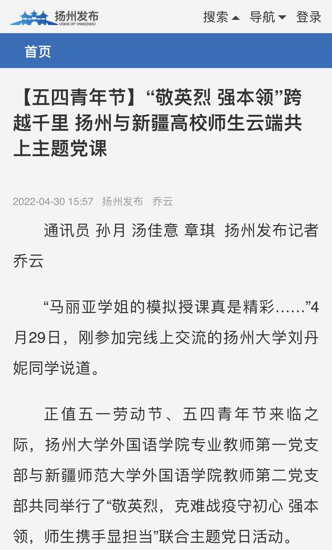 正值五一劳动节、五四青年节来临之际,扬州大学外国语学院专业教师第一党支部与新疆师范大学外国语学院教师第二党支部共同举行了“敬英烈,克难战疫守初心 强本领,师生携手显担当”联合主题党日活动。