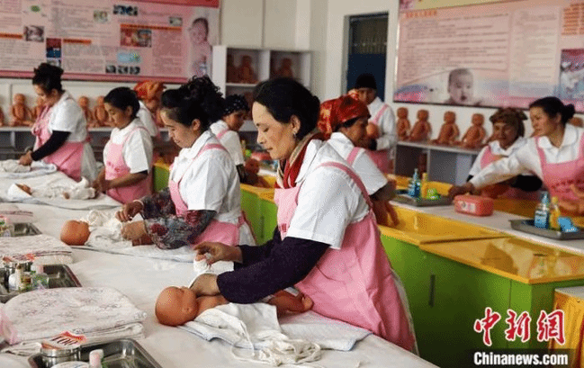 2014年5月27日,新疆喀什巾帼家政学校内,维吾尔族妇女学习为婴儿按摩,为将来成为一名月嫂做准备。中新社发 张浩 摄