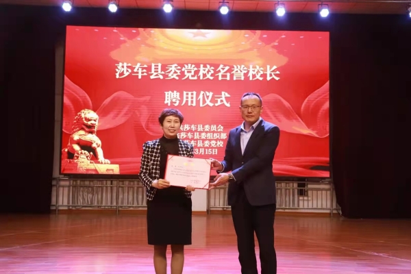 仪式上宣读了莎车县委党校名誉校长聘任决定,莎车县相关县领导为孙秀玲同志颁发莎车县委党校名誉校长聘书。