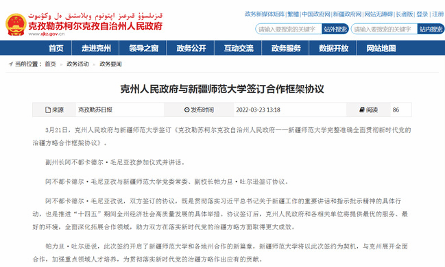 3月21日,克州人民政府与新疆师范大学签订《克孜勒苏柯尔克孜自治州人民政府——新疆师范大学完整准确贯彻新时代党的治疆方略合作框架协议》。
