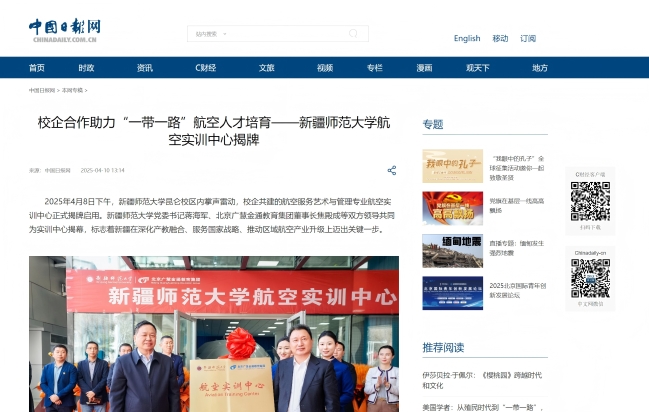 (中国日报新疆记者站记者 毛卫华、王静)2025年4月8日下午,新疆师范大学昆仑校区内掌声雷动,校企共建的航空服务艺术与管理专业航空实训中心正式揭牌启用。新疆师范大学党委书记蒋海军、北京广慧金通教育集团董事长焦殿成等双方领导共同为实训中心揭幕,标志着新疆在深化产教融合、服务国家战略、推动区域航空产业升级上迈出关键一步。