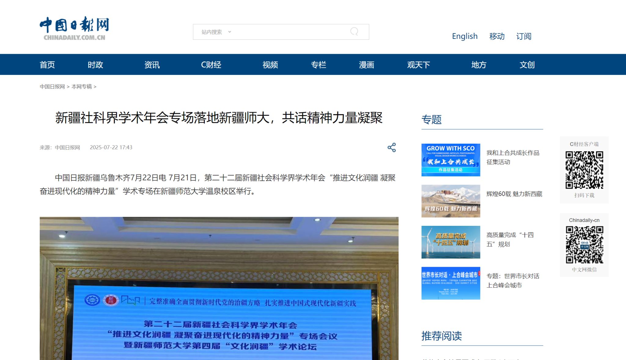 中国日报新疆乌鲁木齐7月22日电 7月21日,第二十二届新疆社会科学界学术年会“推进文化润疆 凝聚奋进现代化的精神力量”学术专场在新疆师范大学温泉校区举行。