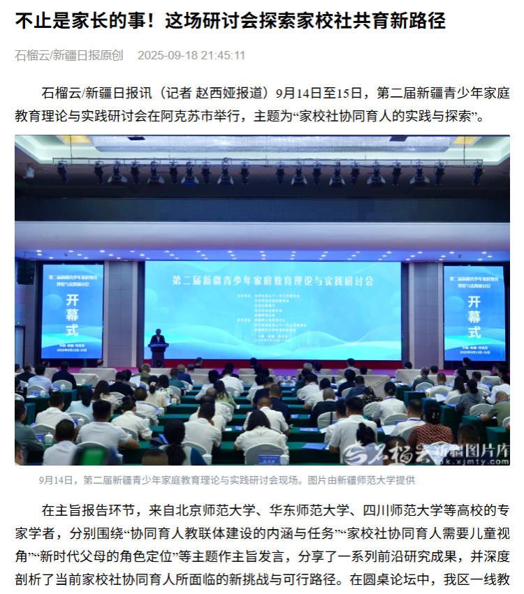 石榴云/新疆日报讯(记者 赵西娅报道)9月14日至15日,第二届新疆青少年家庭教育理论与实践研讨会在阿克苏市举行,主题为“家校社协同育人的实践与探索”。