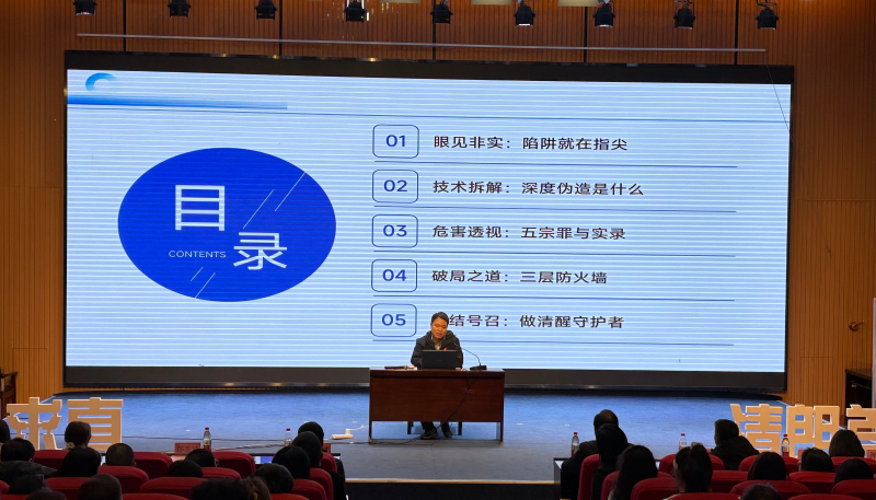 活动现场,郝宗波以深度伪造技术为核心展开专题授课,从“眼见非实的陷阱场景”“技术原理拆解”“危害透视”“破局之道”到“责任号召”层层深入,揭示深度伪造技术“以假乱真”的特性。在技术解析环节,他用通俗易懂的语言,详细解说了换脸、唇形同步、面部重现、语音克隆四种核心伪造手法,指出大学生因社交活跃、情感信任度高等特点成为易受攻击的目标。