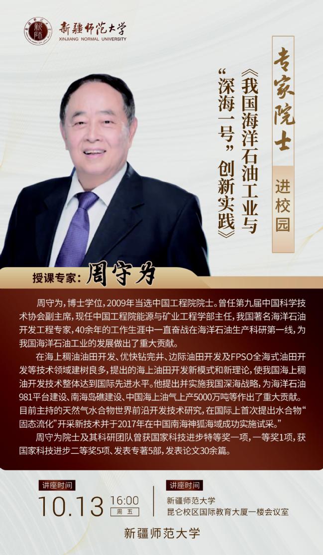 周守为,博士学位,2009年当选中国工程院院士。曾任第九届中国科学技术协会副主席,现任中国工程院能源与矿业工程学部主任,我国著名海洋石油开发工程专家,40余年的工作生涯中一直奋战在海洋石油生产科研第一线,为我国海洋石油工业的发展做出了重大贡献。