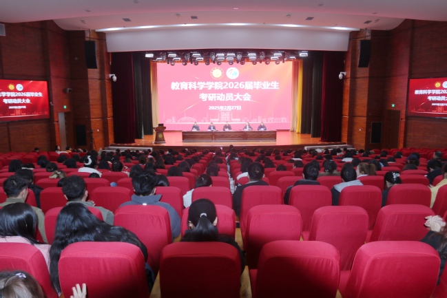 为落实学校党委关于做好毕业生考研服务工作安排,调动学院本科生考研积极性,帮助学生坚定考研目标做好考研准备,2月27日下午,我校教育科学学院在温泉校区昆仑讲堂召开2026届毕业生考研动员大会。学院全体领导出席会议,学业班主任及教学科研办公室和学生工作办公室工作人员、学院2026届毕业生及大一、大二共500余名学生参加会议。教育科学学院党委副书记、纪委书记阿不都合力力·卡德尔主持会议。