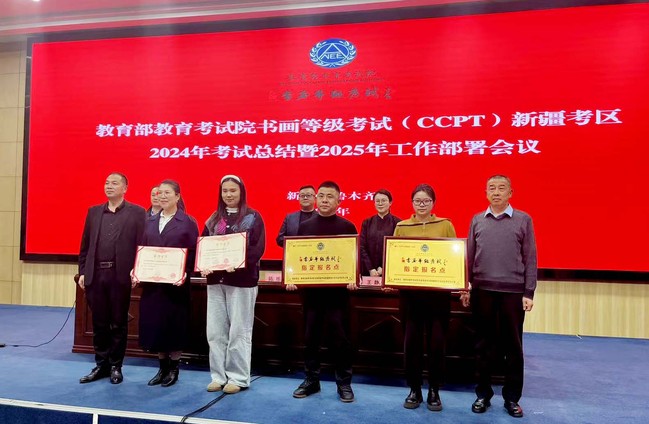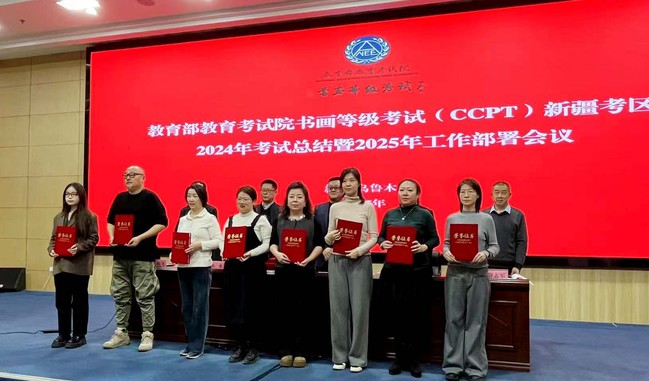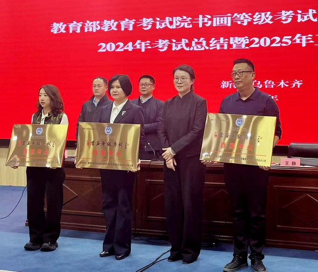 教育部教育考试院书画等级考试新疆维吾尔自治区考务委员会委员、考试办公室主任马腾飞作《2024年考试年度报告》,总结了全疆教育系统和文旅系统的支持、考点以及报名点建设、报考规模、开考科目等具体情况。会议对2024年表现突出的优秀组织单位及先进考务工作者进行表彰,树立典型以激励全疆考务队伍的建设并对新增考点和指定报名点举行了授牌仪式。