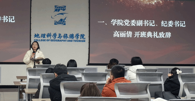 典礼中,我校地理科学与旅游学院党委副书记、纪委书记高丽倩发表致辞,首先对拔尖班的成立表示热烈祝贺,并强调了拔尖班在学院人才培养体系中的重要地位,提出学院汇聚最优质的教育资源,为学员提供个性化的培养方案。