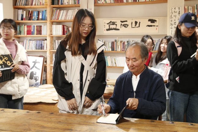 座谈会后,刘亮程先生为师生所藏书籍签名留念,并寄语同学们勤勉向学,与春秋和生命作伴。