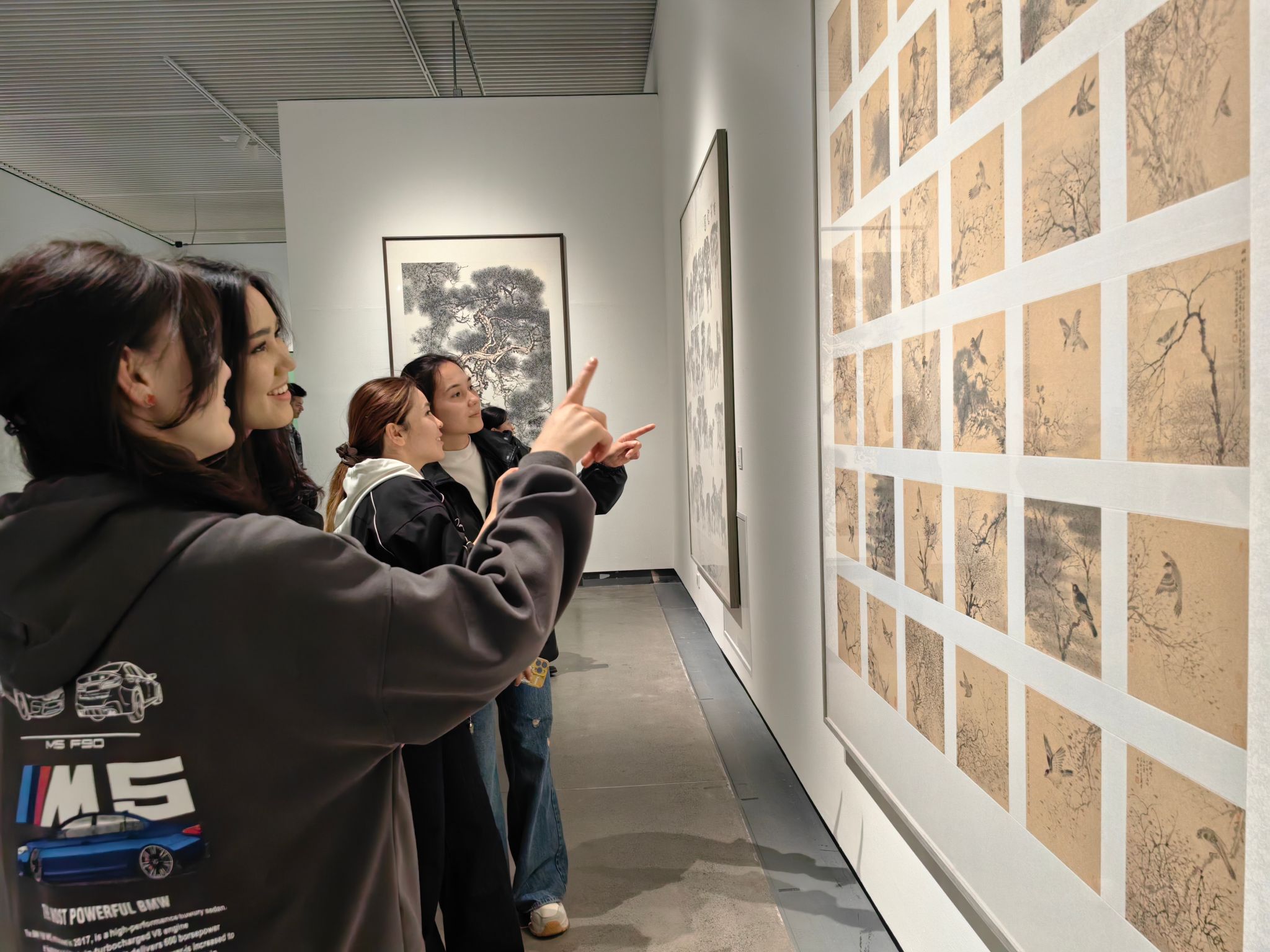 研学活动中,留学生们参观了新疆美术馆展览的上百幅优秀美术作品。我校国际交流与合作处带队教师为留学生们详细讲解了不同画种的种类、笔锋的运用、线条的流畅、色彩的搭配等技巧,留学生们被作品精湛的技艺所吸引,尤其对中国画作品感叹于线条的流畅、高山流水的宏伟、水墨丹青的灵动。吉尔吉斯籍留学生卡扎克诺夫·别克苏勒坦说:“看似简单的笔法,自己却发现很难,绝对是真功夫!有机会的话,一定要体验一下中国画。”