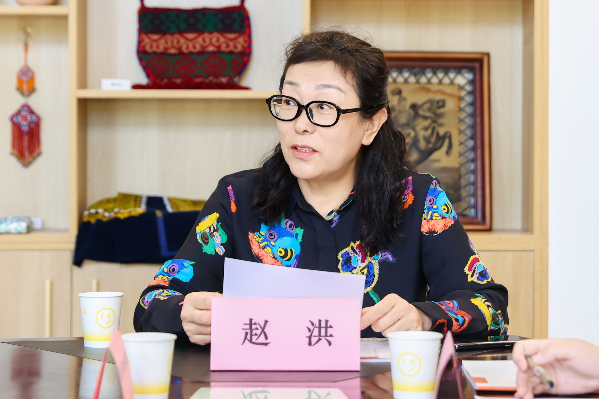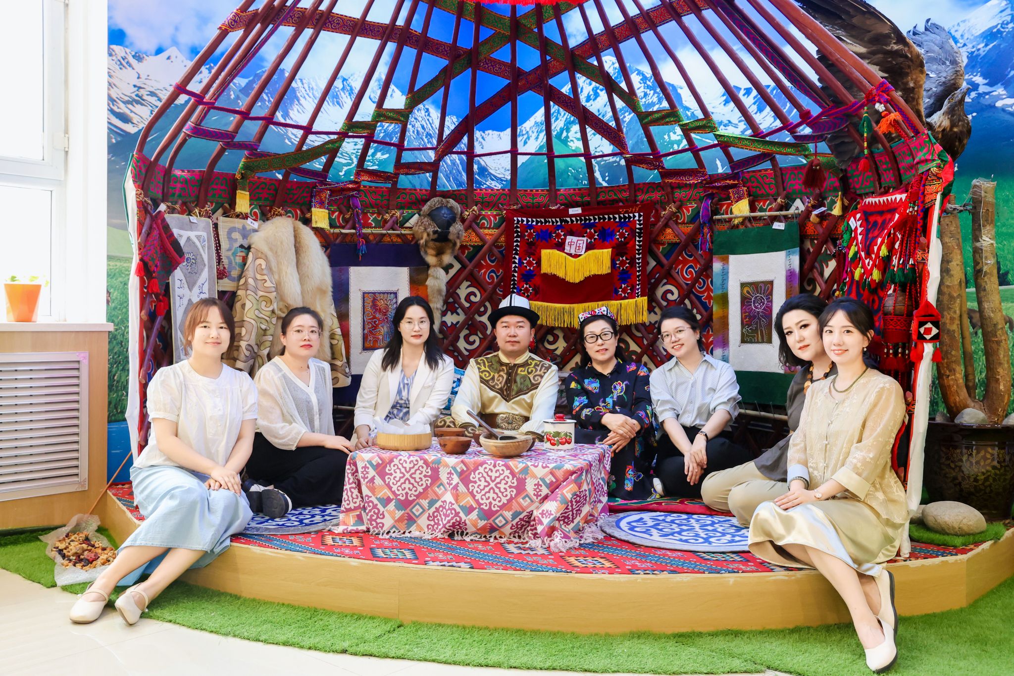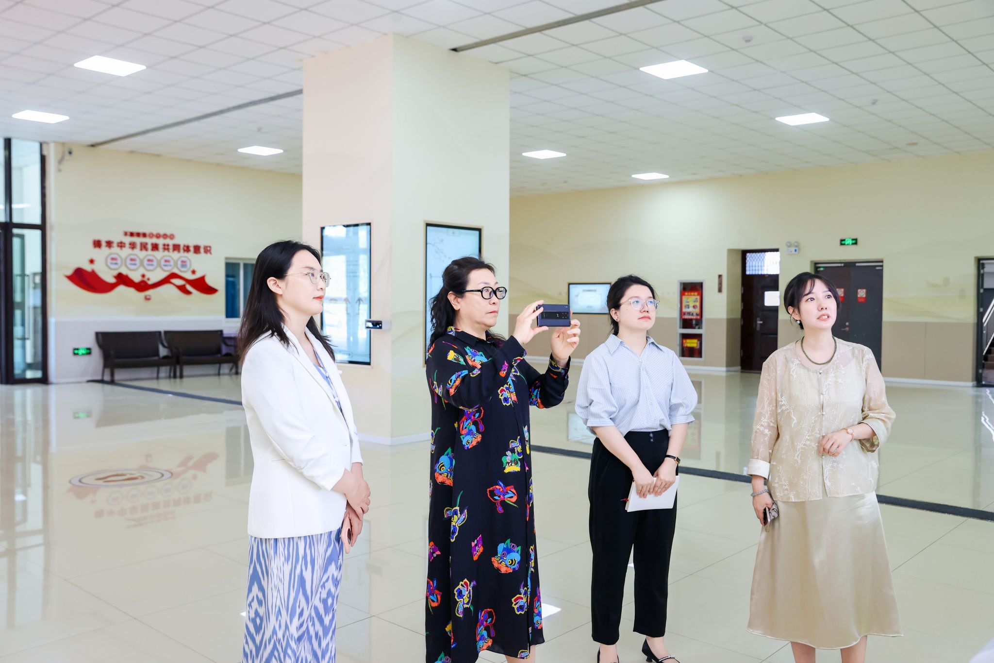 参观结束后,赵洪教授和我校美育中心全体工作人员在玛纳斯非遗展厅就美育工作开展了深入交流。赵洪教授对我校美育工作的探索实践成果予以充分肯定,并就进一步提升美育教学质效提出具体指导意见:一是强化宣传推广,充分发挥新媒体平台优势,拓宽美育工作传播覆盖面;二是深化教学反馈机制,全面收集学生课后学习收获与体会,精准把握教学需求,持续优化课程设计与教学方法;三是立足地区性师范大学定位,充分发挥优质教学设施资源优势,主动承担社会责任,通过开展公益培训、师资帮扶、美育实践基地共建等方式,辐射带动地区美育事业协同发展,切实发挥示范引领作用。
