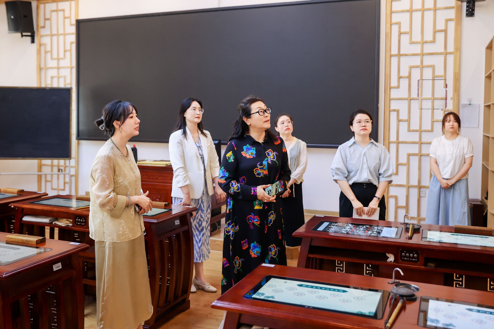 在我校美育浸润实践基地,赵洪教授先后参观了书法体验室、茶艺室、棋室、古琴工作坊、传统手工艺工作坊和陶艺室,仔细了解各功能教室的运行情况,并给予了高度评价。在玛纳斯非遗展厅,州级传承人铁力瓦尔迪演唱了玛纳斯选段,赵教授与其进行了细致的交流,并对我校的非遗文化传承工作所做的努力表示高度认可。她强调,文化传承是美育工作的关键一环,对于弘扬中华优秀传统文化、培养学生的文化自信与艺术素养具有深远意义。