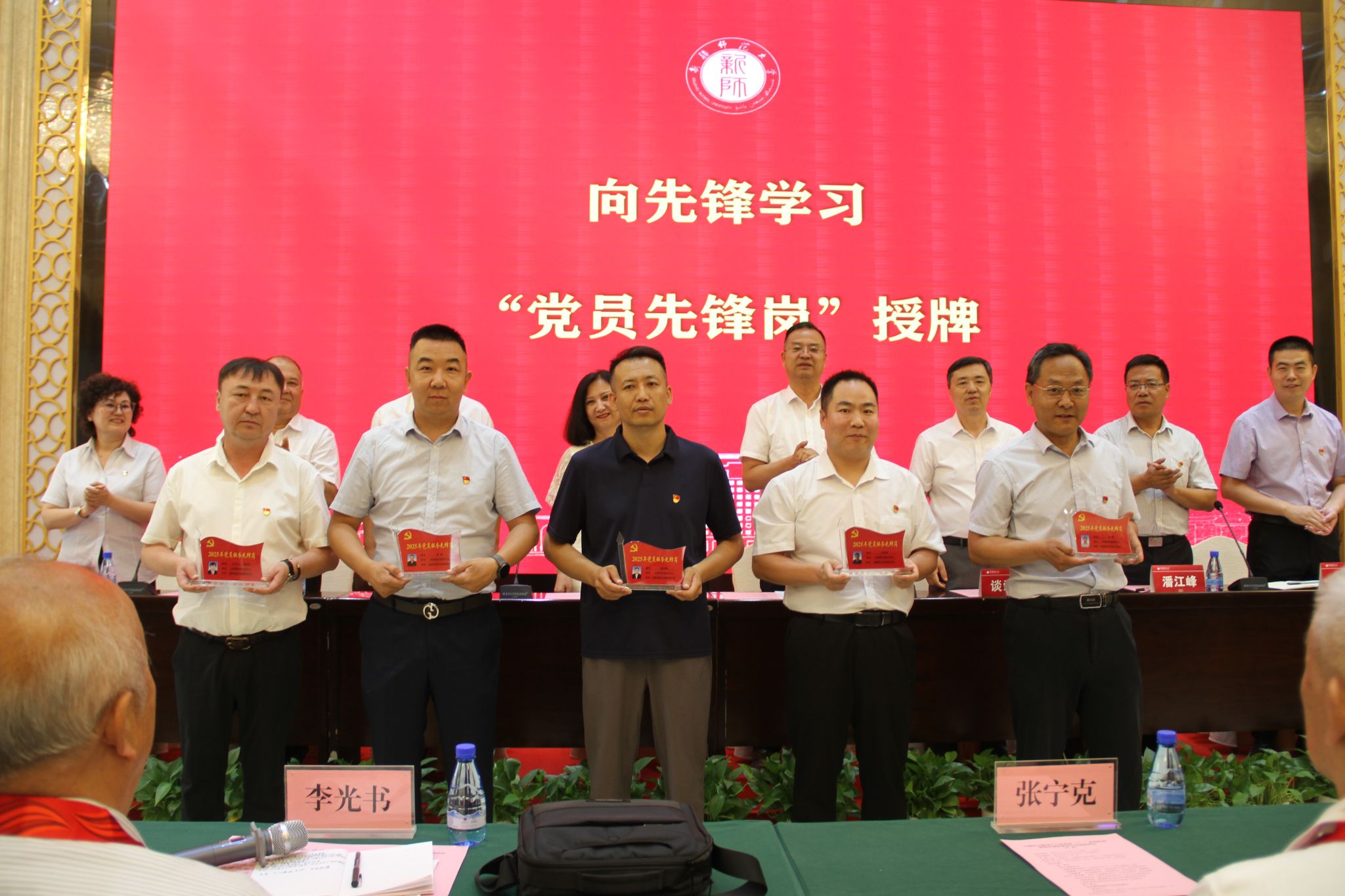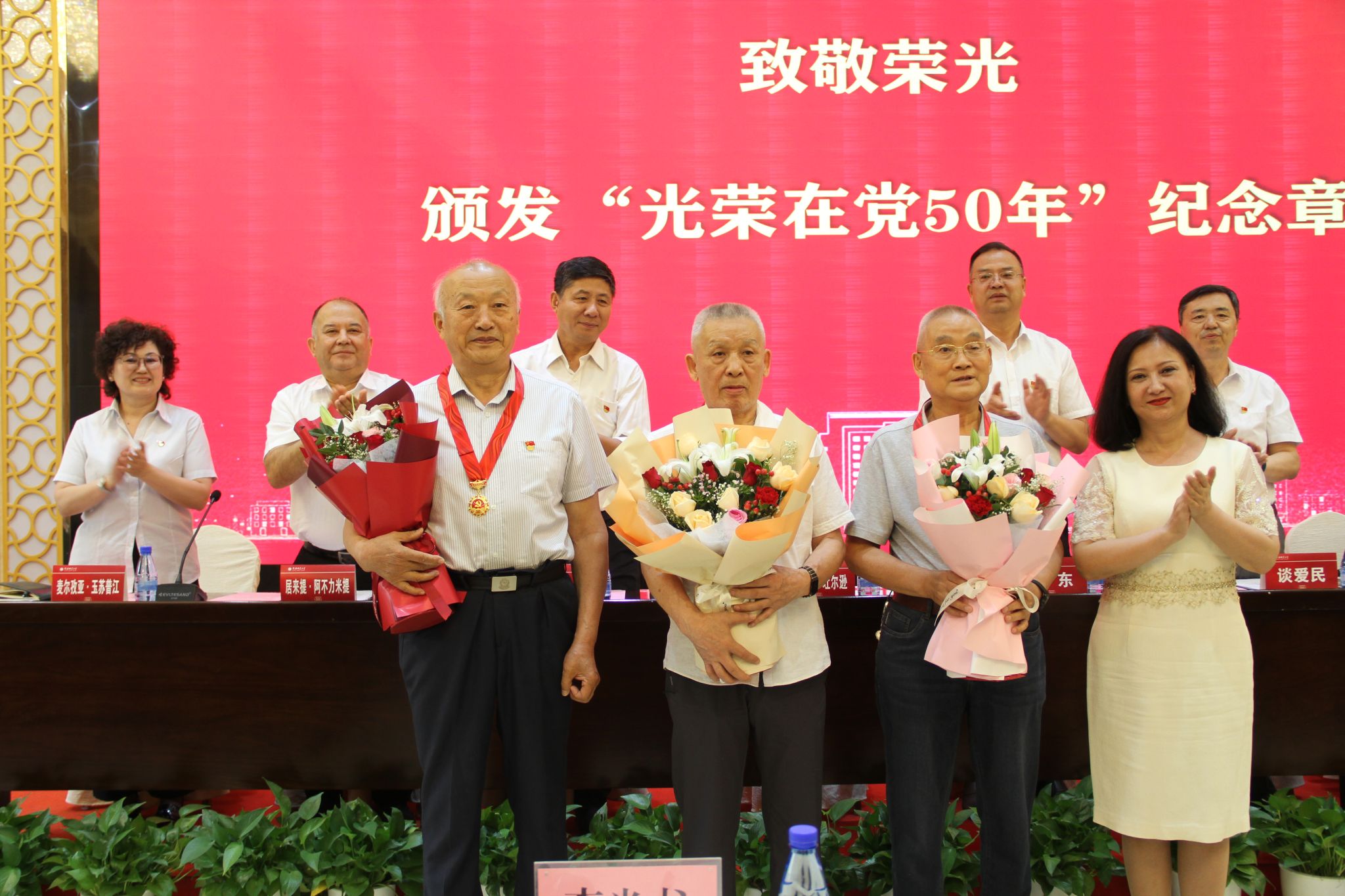 会上举行了迎“七一”党员表彰仪式,弘扬党的优良传统,向老党员致敬。帕提曼·吐尔逊为党龄满50年的老党员代表逐一颁发纪念章,向他们致以崇高敬意与诚挚问候。