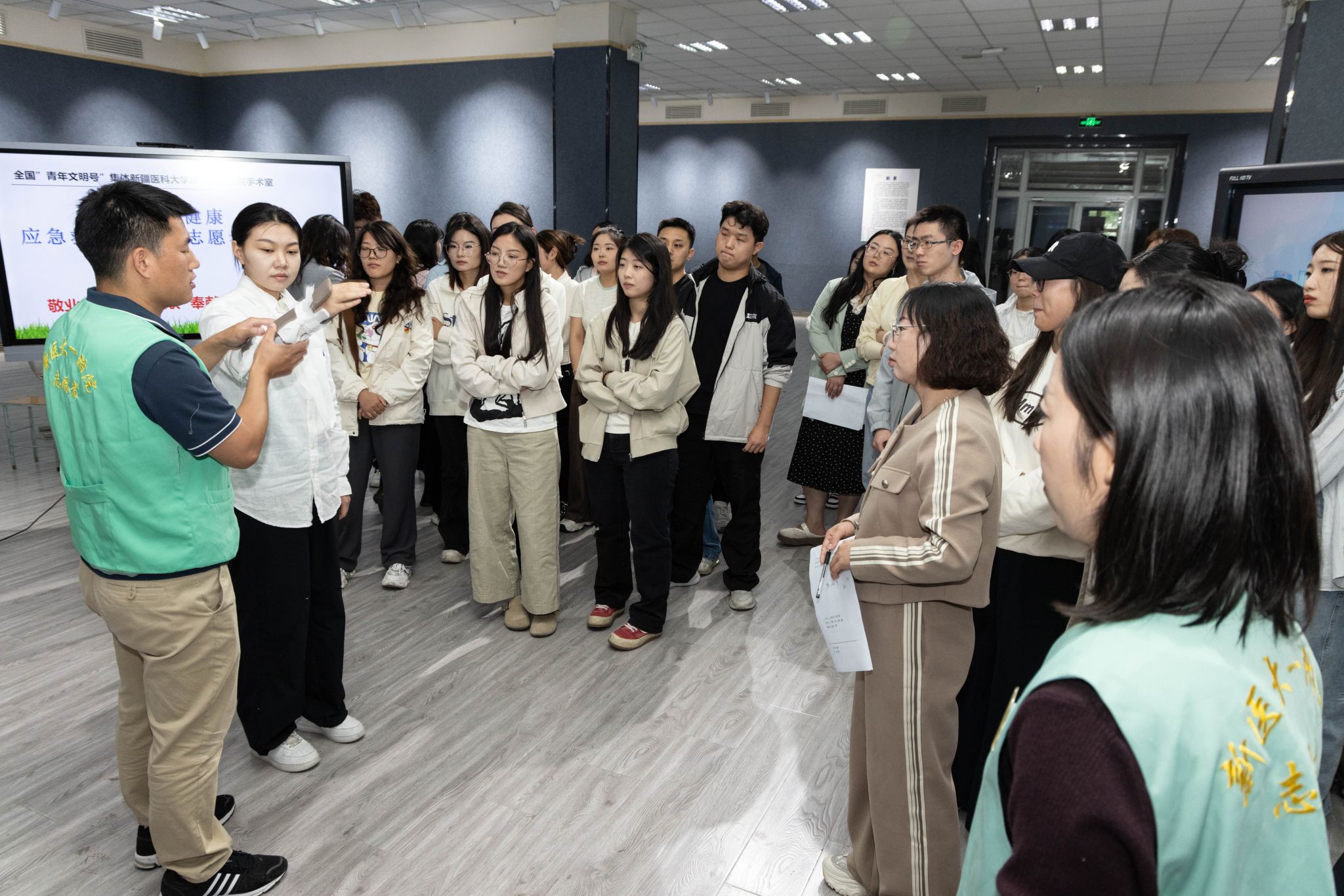 为提升师生应急救护知识和急救技能,9月3日,我校美术学院党委与新疆医科大学第一附属医院手术室第六党总支、新疆护理学会日间手术专业委员会、中国南丁格尔志愿护理服务总队新疆医科大学第一附属医院分队联合开展“传递健康,应急救护进校园”主题党日活动。我校美术学院党委书记比拉力江·阿不力孜、副院长王静以及各党支部党员、在校班级班长、团支书代表参加了此次活动。
