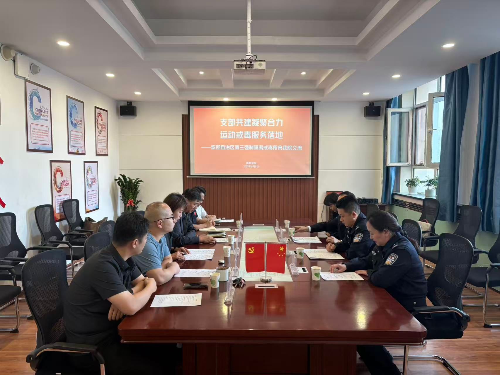 前期,我校体育学院教工第一党支部作为全国党建工作样板支部与自治区第三强制隔离戒毒所第一党支部开展了共建活动。在此基础上,双方以“运动戒毒”为主题开展深入座谈交流,探讨进一步长期稳定合作。体育学院将学科优势与戒毒矫正相结合,开创运动戒毒的服务新途径。