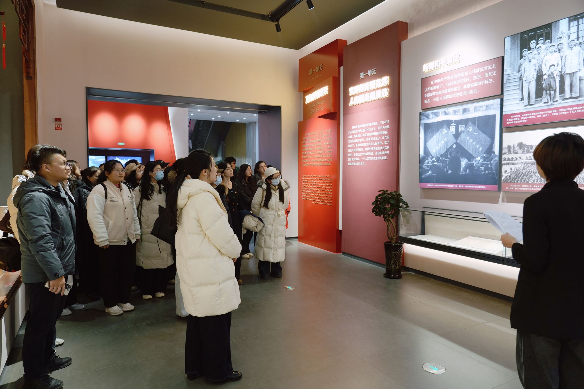 参观过程中,党员教师们结合教育教学实际,向学生干部代表讲述新疆教育事业从普及到优质的发展历程,分享扎根教育一线践行育人初心的感悟;学生干部们围绕展览中的青春元素与党员教师探讨新时代青年在新疆高质量发展中的使命担当。