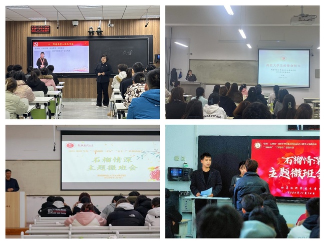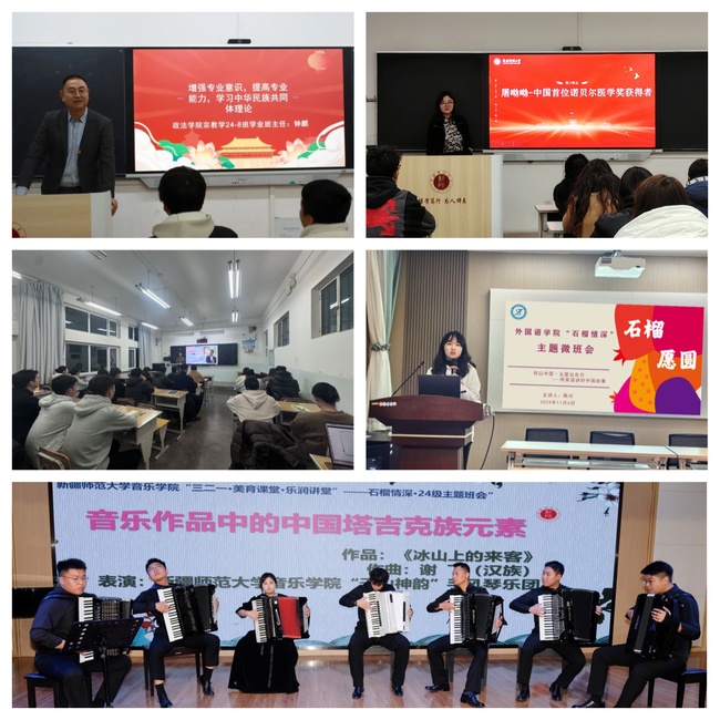 此外,各学院还通过多种形式讲述了各民族相互依存、共同发展的历史故事,生动展现了各民族如石榴籽般紧紧抱在一起的深厚情谊。教育科学学院教授冯江英讲述《一生只做一件事,我为祖国守边疆:向我们边境国门英雄致敬学习》、地理科学与旅游学院邀请物理与电子工程学院党委书记李莉讲述《和李妈妈一起静待石榴花开》、化学化工学院副教授杜虹讲述《石榴花话石榴》,数学科学学院党委副书记张培、商学院学工办主任阿丽也·吾买尔进班级深情讲述民族团结的故事。微班会课中,同学们积极提问并发言,分享了身边的民族团结事例和师生一家亲的温暖故事。