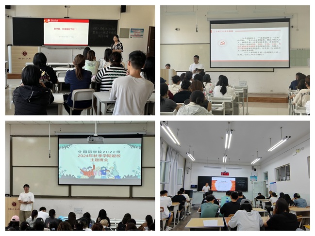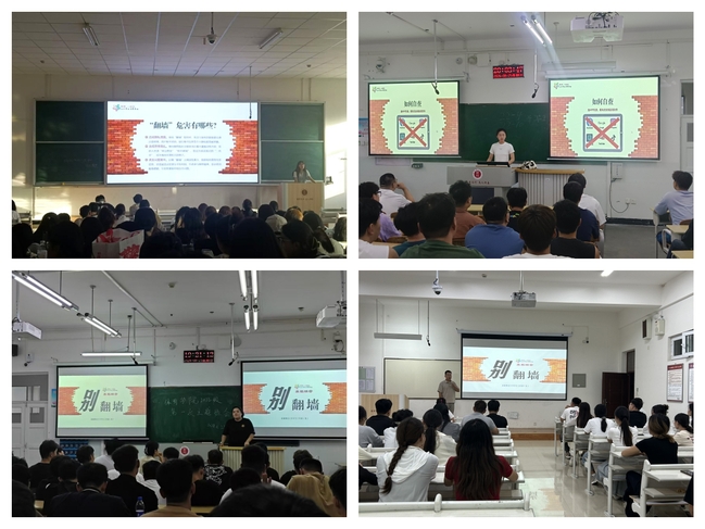 各学院以新学期收心教育和学风建设为重点,教育引导学生做好新学期个人规划,以饱满的精神风貌投入到新学期学习中。班会中,各年级辅导员、学业班主任结合学生管理警示案例集、“别翻墙”警示教育PPT,开展校纪校规教育,教育引导学生增强法治意识,杜绝违法违纪行为。重点围绕防范电信诈骗、网络安全教育、消防安全教育等进行了警示教育,提醒学生绷紧防范之弦,保护个人网络信息安全,做到宿舍用电安全,提高自救能力,增强安全意识。