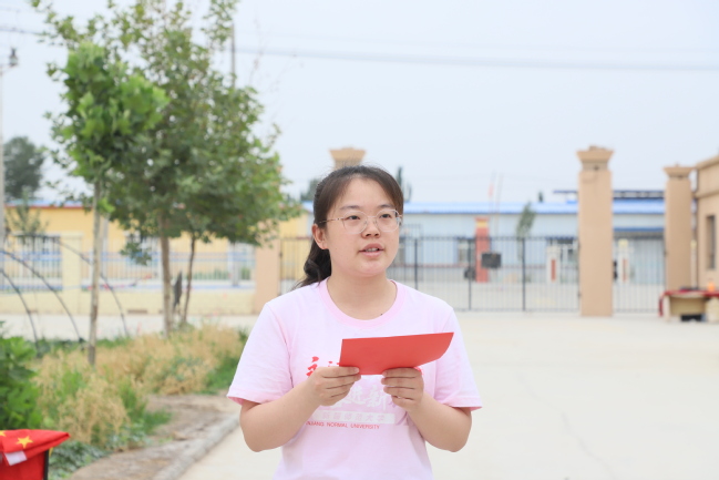 主题团日活动在团歌《光荣啊!中国共青团》中拉开序幕。实践团成员王毅明带领全体团员重温入团誓词。实践团成员、我校第三期“胡杨先锋”优秀学生党员培训班学员孙瑞瑞,实践团成员、团员代表努尔木哈买提·叶尔生分别发言。孙瑞瑞在发言中谈到,近十天的相处中,最大的感受就是学生们的纯真和村民们的朴实。与“小课堂”的学生们一起进行绘画、剪纸、唱歌、跳舞等丰富多彩的活动,一起收获了快乐。青春要在艰苦奋斗中磨砺,新师青年要在社会实践的大课堂中学习本领。努尔木哈买提·叶尔生通过这次实践,深刻地认识到了农村发展发生了巨大的变化。