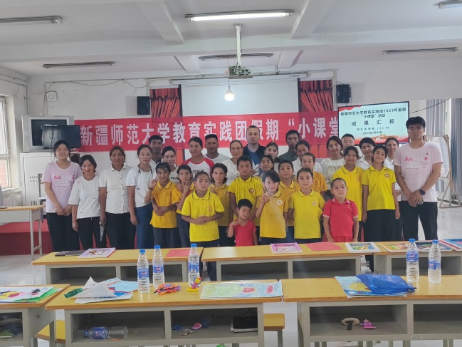 在吐木休克萨热依村(1村),教育实践团成员王崇屹和黎芷希进行成果汇报,包括暑假作业、音乐舞蹈、美术、体育等方面的展示,后由亚喀艾日克乡领导为本次“小课堂”活动中表现突出的同学颁发由新疆师范大学准备的奖品。