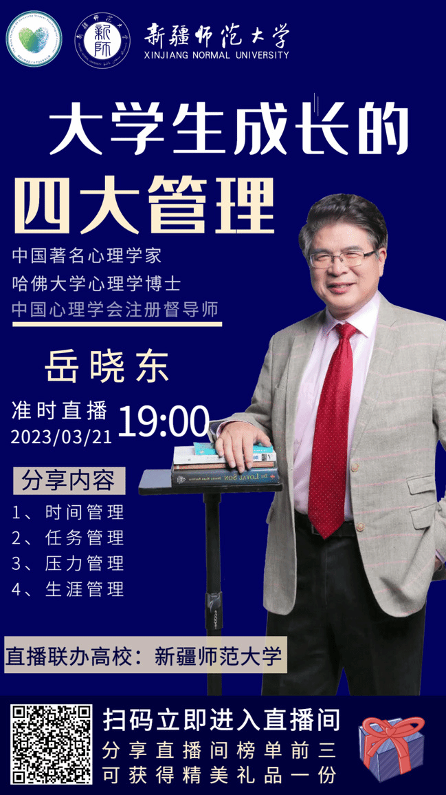 为加强我校心理健康教育工作,进一步体现心理委员示范单位引领作用,更好地帮助在校学生了解如何管理自己的大学生活,培养自我管理胜任力,提高大学生活质量,我校心理健康教育服务中心于3月21日联合全国心理委员工作平台邀请岳晓东博士做“大学生成长的四大管理”主题讲座。累计6638人次观看,500余名学生参与互动反馈。